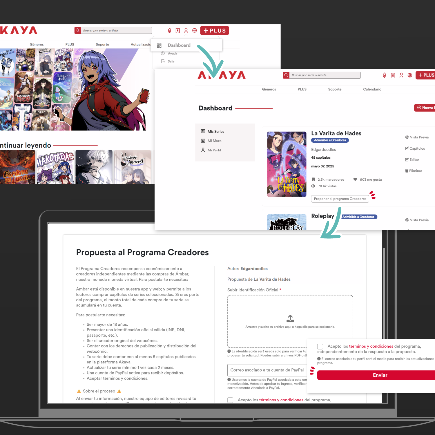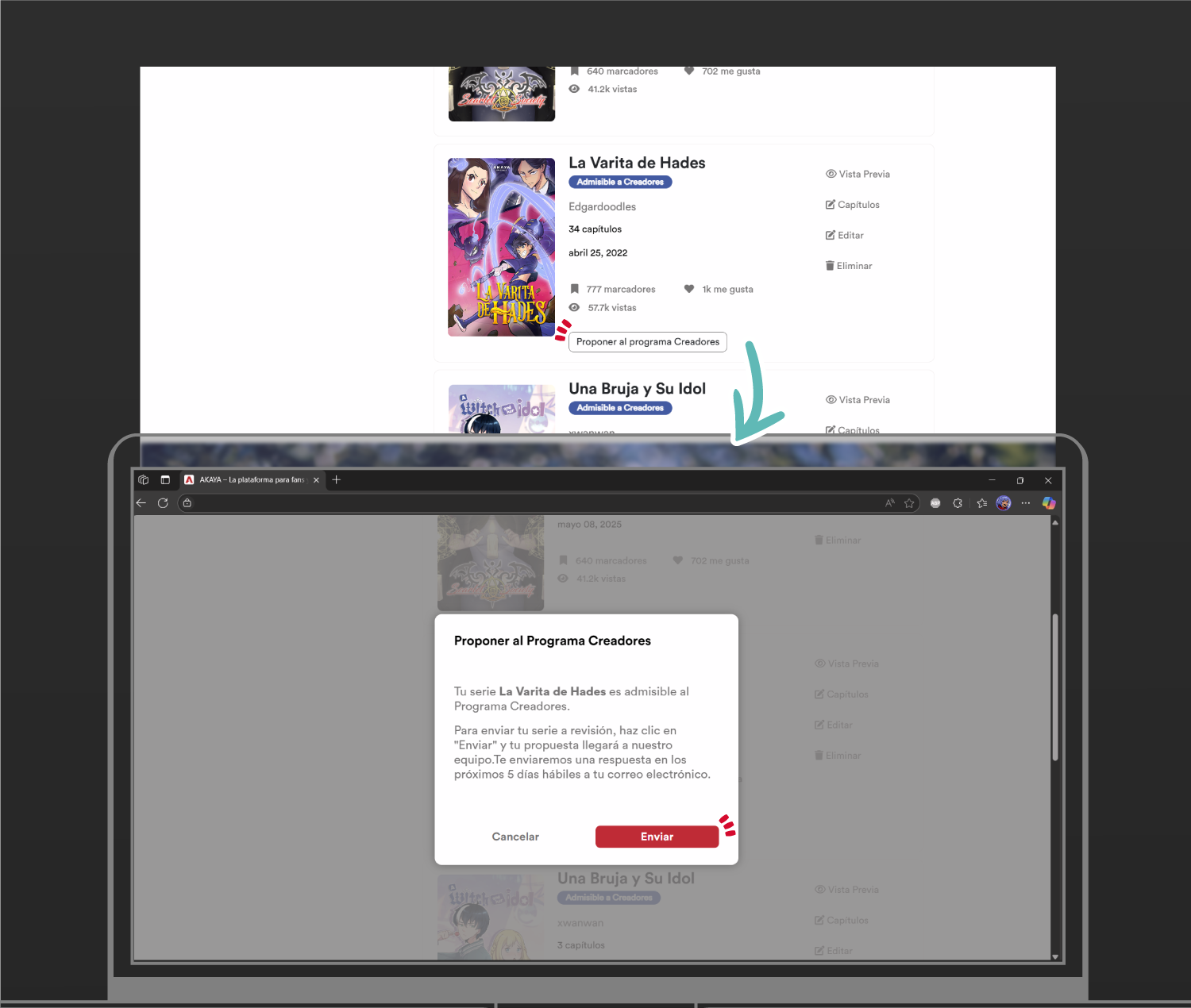 Pero no te preocupes, nosotros te ayudamos en todo el proceso. Cuando una de tus series esté lista, verás en su tarjeta de dashboard la etiqueta “Admisible al programa” y el botón “Proponer al programa”. Una vez que encuentres la serie que deseas postular, puedes seguir uno de los siguientes métodos.