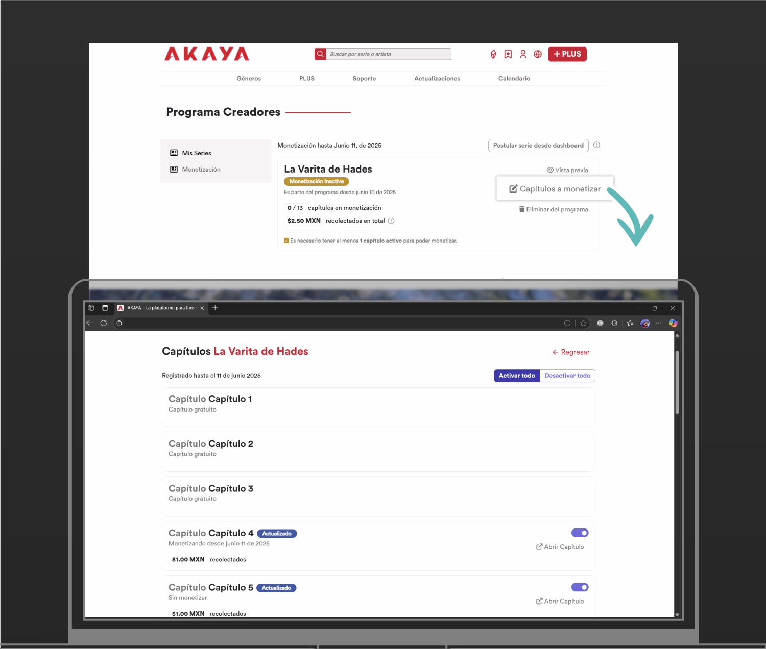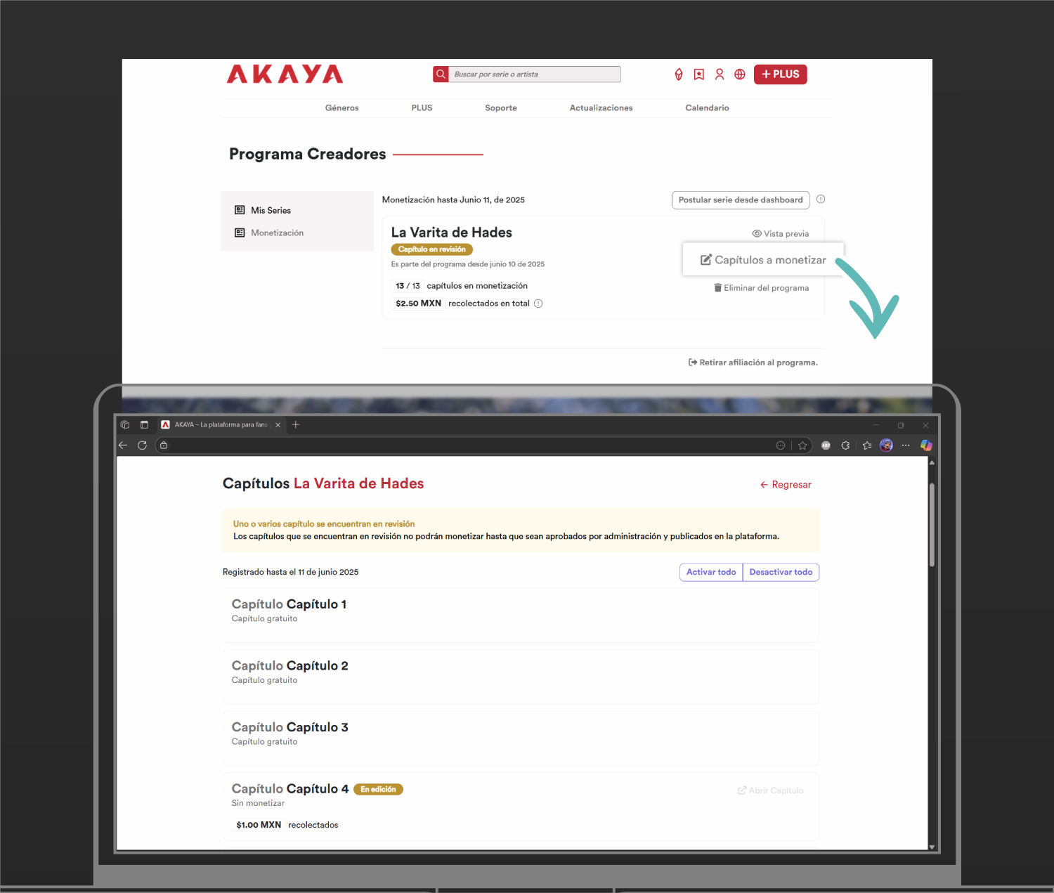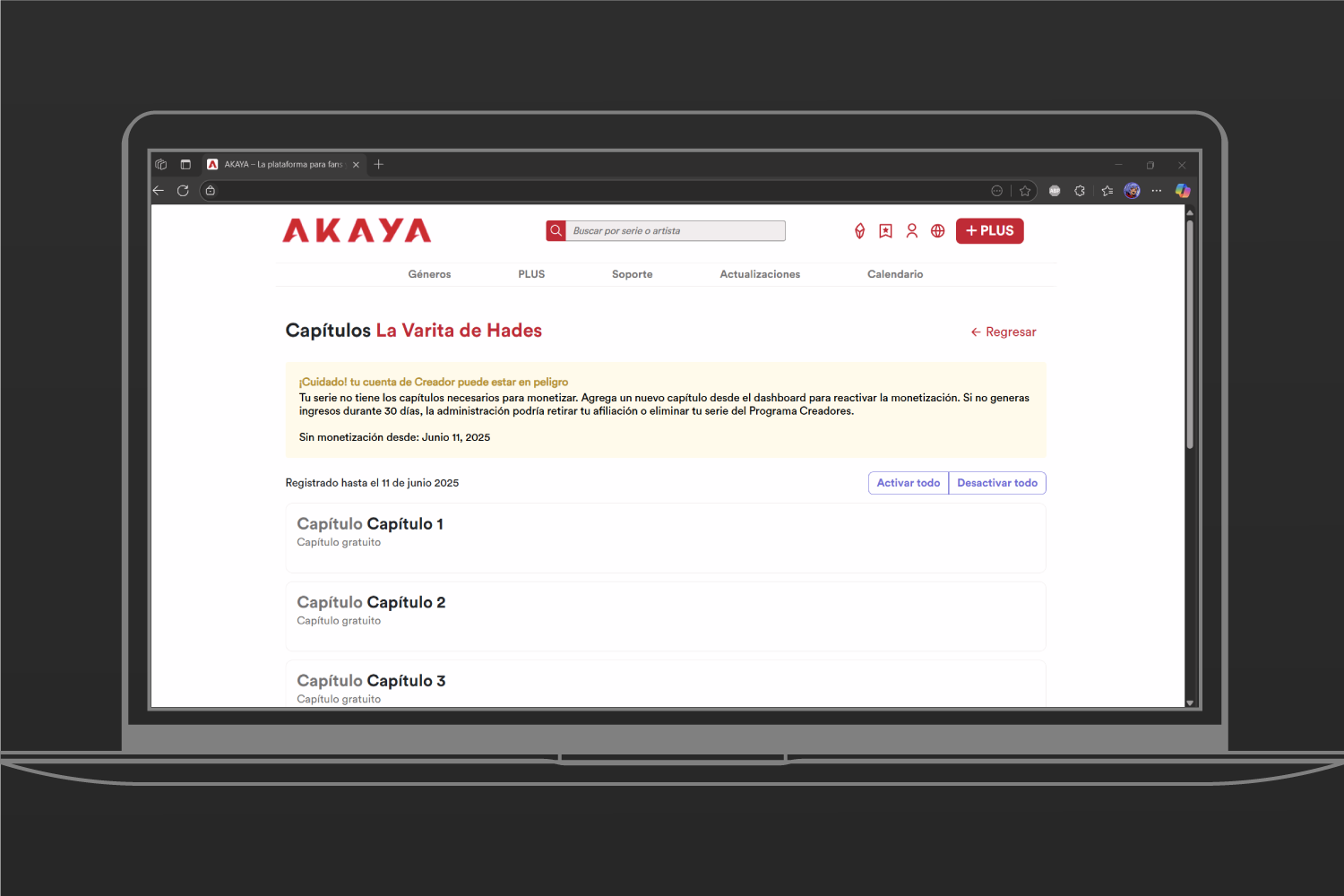 Tu serie debe contar con al menos 4 capítulos publicados para poder activar la monetización. Y si permanece sin monetizar por más de 30 días, el equipo de administración podrá eliminar tu serie del Programa Creadores.