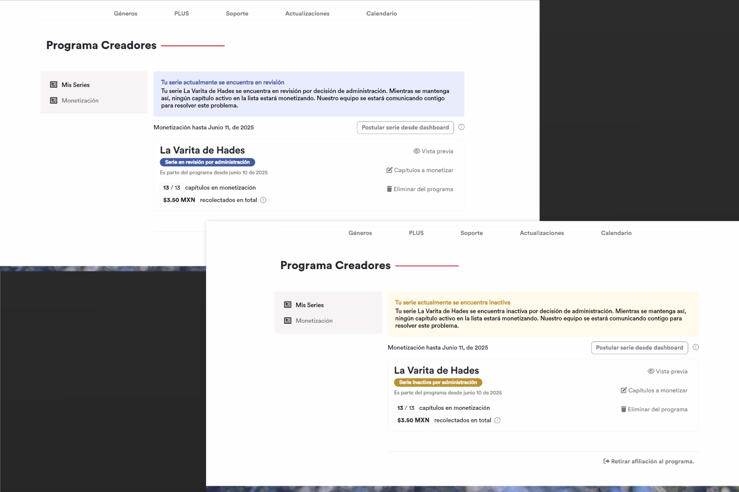 Sin embargo, si no se resuelven los puntos solicitados en el plazo esperado, tu serie podría ser eliminada del Programa Creadores o incluso administración podría retirar tu afiliación del programa.